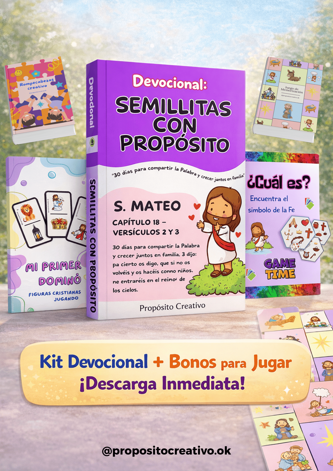 Incluye el Devocional de 30 días + 4 bonos de regalo: Juego de Memorización, Rompecabezas de imágenes bíblicas, Juego de Cartas “¿Cuál es?” y Mi Primer Dominó Bíblico.